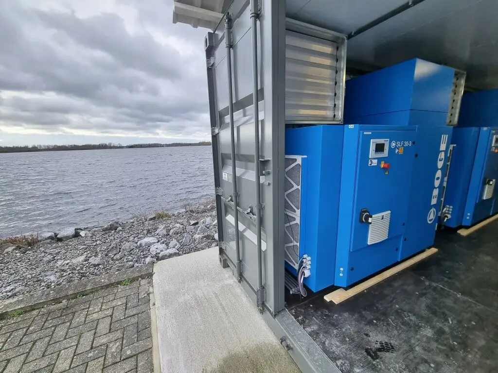 Voor het overbruggen van de tijd van de oude naar de nieuwe installatie, heeft BOGE in deze periode een tijdelijke oplossing bij water-link geplaatst in de vorm van een ‘leen-installatie’. Met de volledige perslucht installatie (gebouwd in een container) kon water-link tijdens de bouw van de nieuwe container hun klanten veilig drinkwater blijven garanderen.