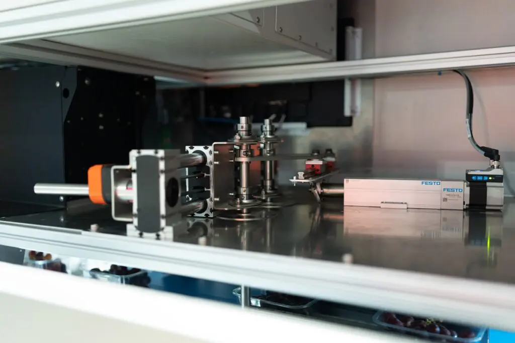 De reden om uiteindelijk te kiezen voor Simplified Motion Series was een logische. Gearbox was al op de hoogte van deze eenvoudige maar complete aandrijfoplossing en maakte al snel de beslissing toen Festo binnen één dag een SMS-element – in dit geval een ELGS-BS-60 – ter beschikking kon stellen om te testen. De testfase is omvangrijk en belangrijk om onder andere vast te stellen of de SMS in staat was de punnets bij deze snelheden uit de lijn te duwen. Van Meel: “Het was dus een belangrijk voordeel dat Festo op deze korte termijn kon reageren met een ‘van de plank’ product. Daarbij werken we erg prettig samen met Festo waar specifieke kennis en producten beschikbaar zijn die we goed kunnen gebruiken. Op deze manier hebben we een solide basis ontwikkeld voor een machine die we verder kunnen doorontwikkelen voor toepassing wereldwijd.