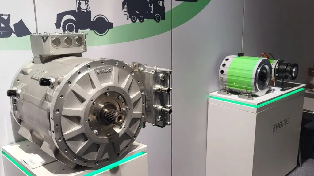 Op de Bauma 2022 stonden de stands van de HYDAC Group en ENGIRO GmbH, dicht bij elkaar. Ook waren diverse groene elektromotoren en inverters van de fabrikant uit Aken te zien op de stand van HYDAC. Grappig detail, bij HYDAC was het verboden te fotograferen, bij ENGIRO gaven ze de pers alle vrijheid.