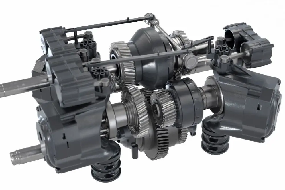 Bij het wegrijden stuurt de pomp een beetje uit en gaat olie leveren aan de eveneens verstelbare hydromotor. Een elektronisch gedeelte binnen de transmissie regelt de juiste hoek onder invloed van de software, met stelmotoren en stangen. Des te hoger de snelheid, des te verder de pomp uitzwenkt. De hydromotor zwenkt bij een hogere snelheid echter steeds verder terug naar de neutraalstand. Zo gaat via het planetair geforceerd een steeds hoger aandeel van de vermogensoverdracht puur mechanisch.