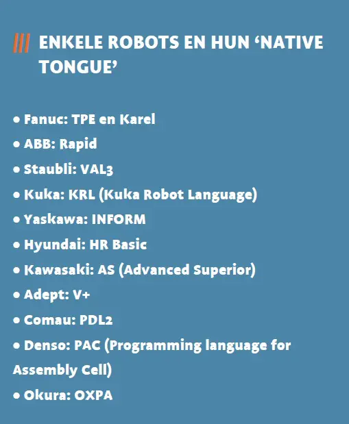 Van der Vlugt stelt dat je hiermee specifieke eigenschappen low level heel precies kunt programmeren en dus controleren. “Wat die eigenschappen zijn en hoe je die programmeert, verschilt per robot en is historisch zo gegroeid. Zo zijn robots van Fanuc en Yaskawa beiden Japans en hebben ze bovendien een zelfde basis in een sterk opkomende automotive sector. Deze had bijvoorbeeld een grote behoefte aan specialistische lasfunctionaliteit, wat eisen stelde aan de manier van aansturen. Niet verwonderlijk dus dat Karel van Fanuc en INFORM van Yaskawa best wat overeenkomsten vertonen. Een Staubli, daarentegen, komt uit de textiel, waar het heel precies priegelen met garen weer hele andere dingen vroeg. Je ziet dan ook specifieke ‘priegelfuncties’ terug in hun programmeertaal VAL3, wat er meteen ook toe leidt dat ze vaak gekozen worden bij hoognauwkeurige toepassingen.”
