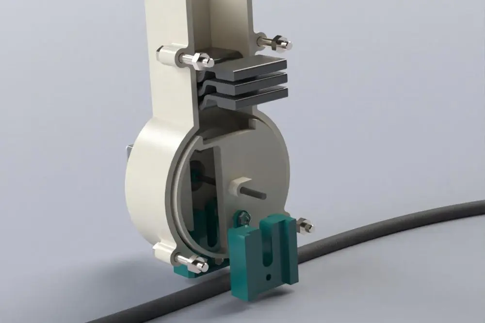 Zodra de lijm is uitgehard, start de robot met de terugweg waarbij hij gelijktijdig de sensorkabel installeert. Ook hiervoor wordt het oppervlak iedere 1,5 meter geschuurd, gereinigd en voorzien van lijm waarna de sensorkabel wordt aangedrukt en een klem wordt geplaatst. De bovenste as bevat de klemmen die door een servomotor aangedreven mechanisme één voor één naar het onderste deel van de module worden gebracht. Hier vallen ze over de kabel heen. Dezelfde motor beweegt ook de gekleurde componenten eronder omhoog en omlaag, waardoor de klem op de lijm wordt gedrukt. Het ontwerp is energiezuinig door slechts één stappenmotor te gebruiken voor meerdere taken. Ook biedt het plaats aan voldoende klemmen voor de bediening in een kleine ruimte. De behuizing is 3D-geprint en met bouten aan elkaar bevestigd.