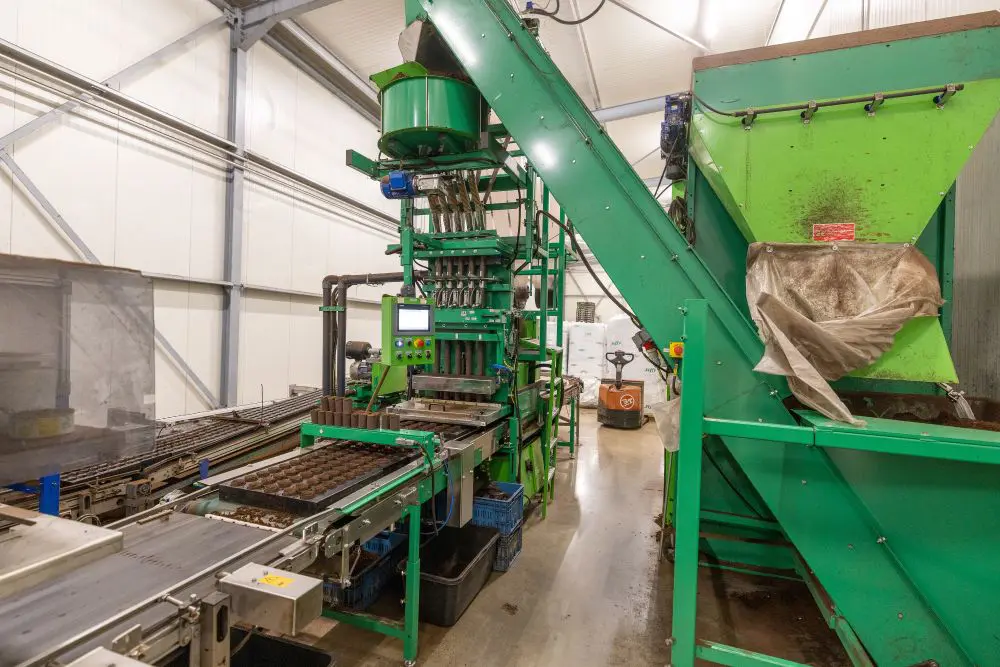 Het begint met wat aarde direct achter het losdok. Bulkzakken met deze grondstof vinden op pallets hun weg naar de Ellepot Tray Filler, een machine die kleine teeltkluitjes vormt. Een robotarm schraapt uit een omkasting laagsgewijs aarde op een transportband die naar de bovenkant van de vuleenheid gaat, waar de aarde na lichte beluchting in vijf kousen van dun, biologisch afbreekbaar papier wordt geperst. De gevulde kousen komen uit in plastic trays met rijen van telkens vijf gaten, waar ze worden afgesneden op de hoogte van het kluitje. De trays schuiven vervolgens per rijtje door voor verdere behandeling van de kluiten. Onder een stansarm worden daar gaten in geprikt, even verder laat een zaaitrommel in elk gat een zaadje vallen. Alles automatisch, instelbaar op een controlepaneel en te volgen via de monitor.