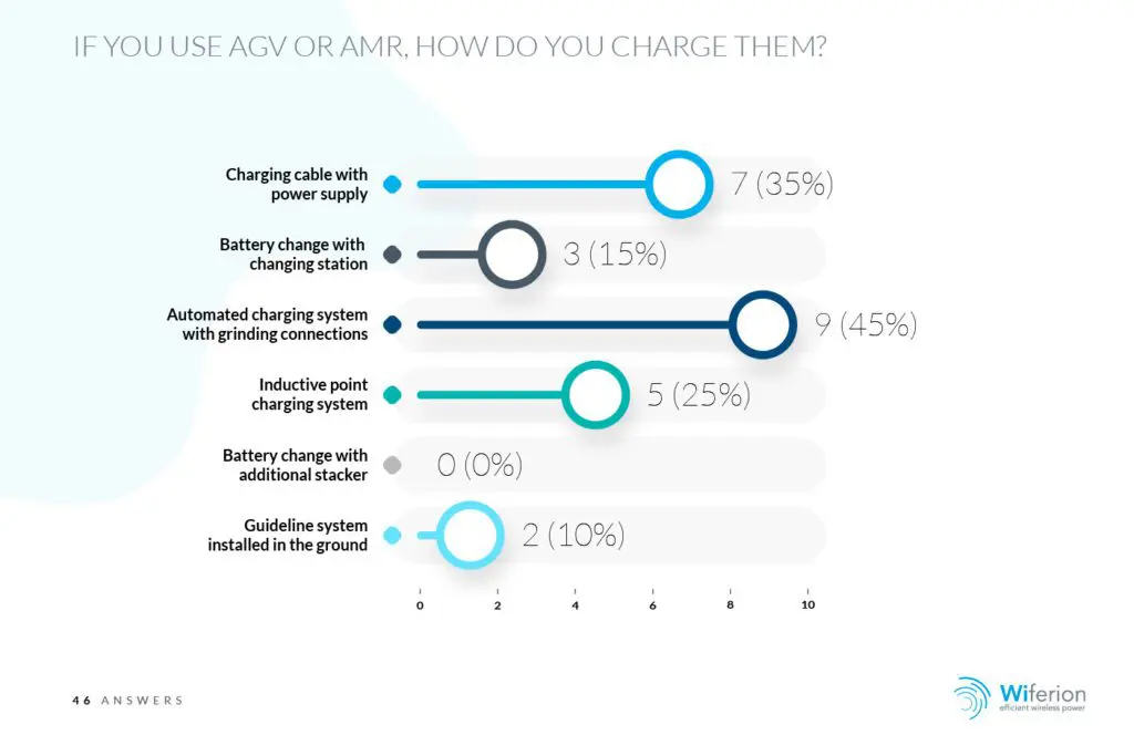 Een blik op het oplaadproces levert interessante inzichten op. Een derde van de respondenten geeft aan dat het oplaadproces meer dan een uur duurt, en nog een derde heeft de duur van het oplaadproces helemaal niet bepaald. Wat vooral opvalt, is dat voertuigen overwegend na het einde van de dienst worden opgeladen of zelfs pas wanneer de energie is verbruikt. Daardoor staan voertuigen langer stil en dreigt productieverlies. Daarom is het des te belangrijker om over robuuste, geautomatiseerde laadprocessen te beschikken die in-proces-lading mogelijk maken en een onderhoudsvrije werking garanderen. Dit kan worden bereikt met inductieve puntlaadsystemen, die een hoog niveau van leveringsbetrouwbaarheid bieden. Zij hebben duidelijke voordelen ten opzichte van traditionele laadsystemen met schuifcontacten of laadkabels. De onderhoudskosten zijn niet onaanzienlijk, maar worden niet geregistreerd of zijn niet bekend bij bijna tachtig procent van de respondenten.